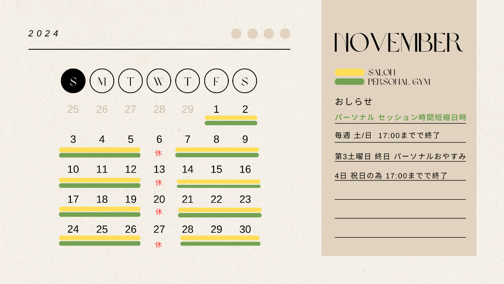 11月【GYM】【SALON】別の予約日程カレンダー詳細