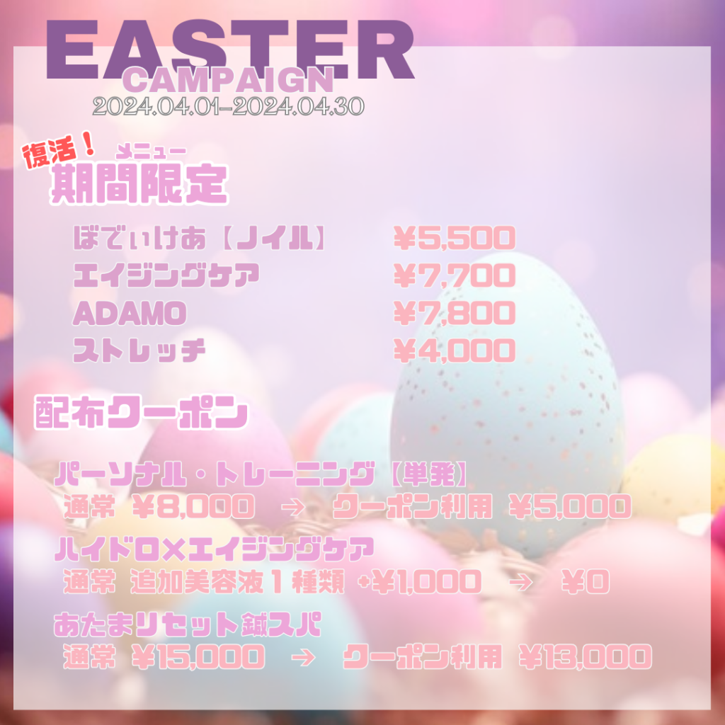4月のクーポンは、EASTER CAMPAIGNクーポンです!