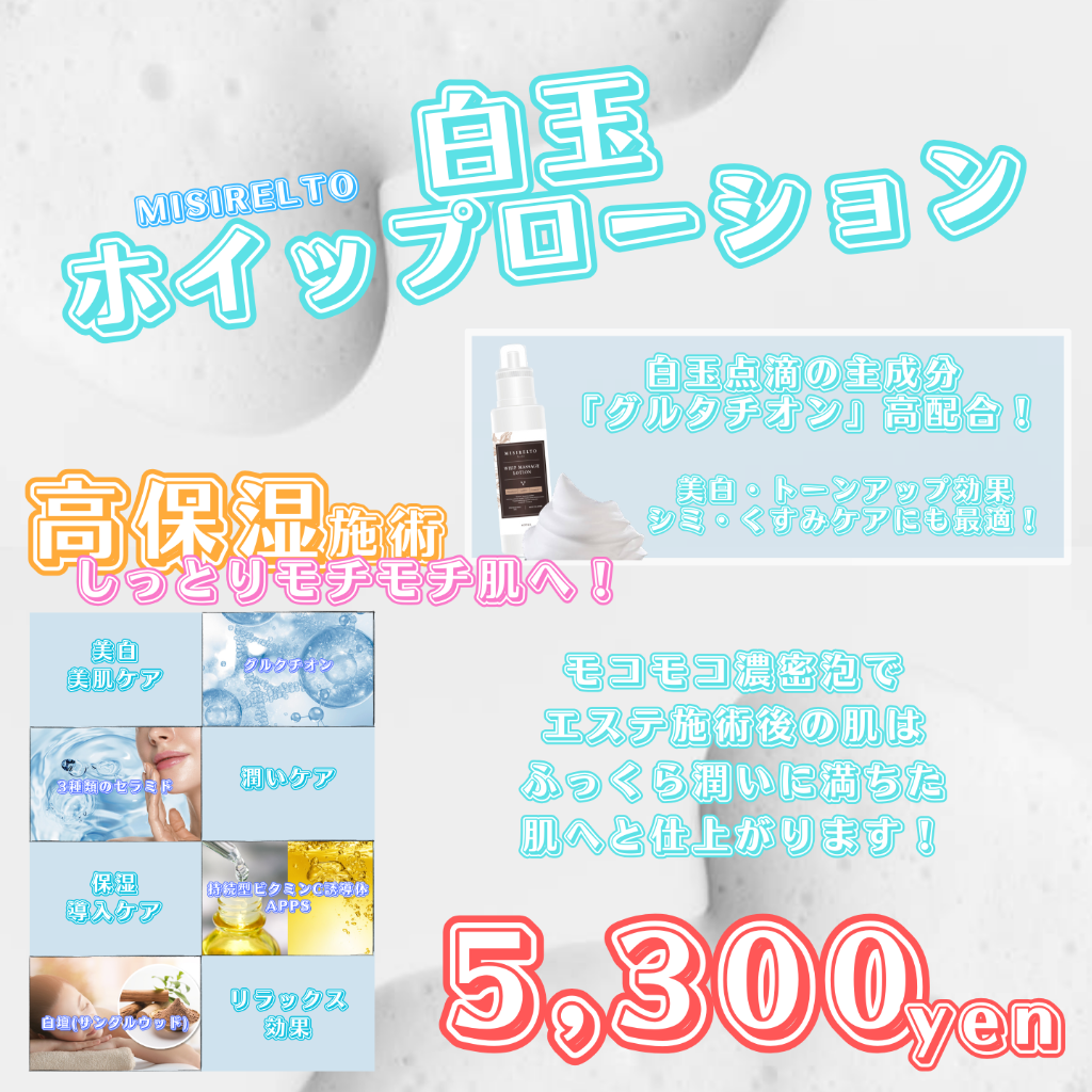 NARCISSUSでは、【白玉ホイップローション】が高保湿効果があり おすすめの施術です!