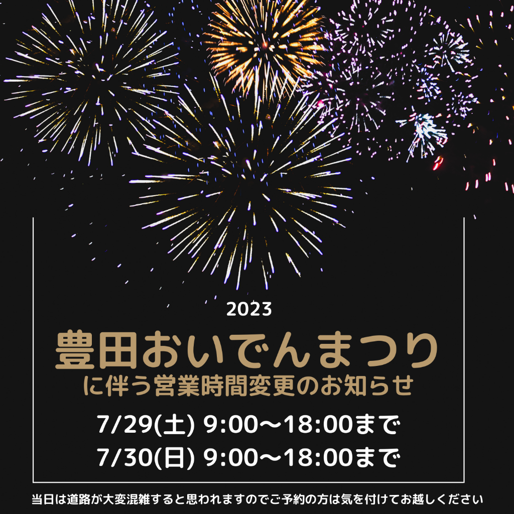 7/29(土)30(日)の豊田おいでんまつりの開催による営業時間変更のお知らせ