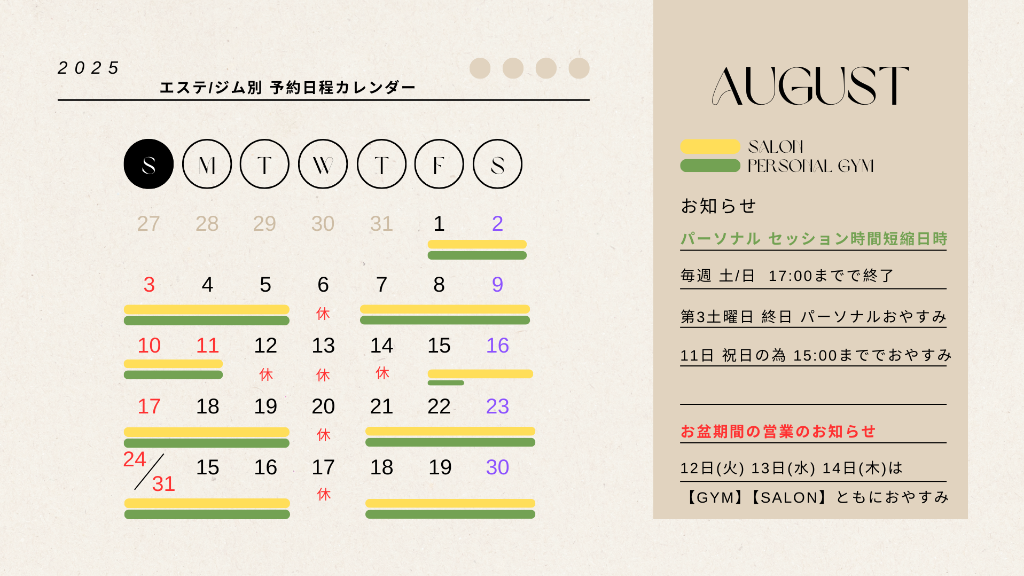 8月【GYM】【SALON】別の予約日程カレンダー詳細