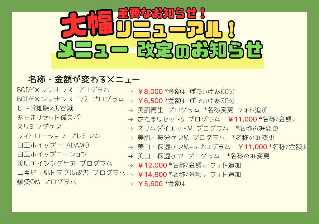 今回は前回お伝えしていない【名称/金額が変更するメニュー】をお知らせします。